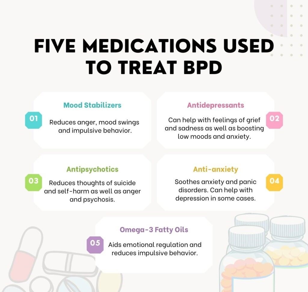 - While there is no specific medication for BPD, certain medications can help manage symptoms such as mood swings, depression, or anxiety. These may include antidepressants, mood stabilizers, or antipsychotics.